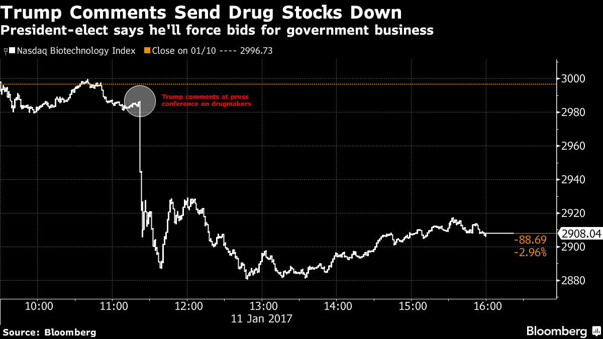 Bỗng chốc ngành dược trở thành mục tiêu tấn công mới nhất của ông Trump – người có thói quen “đàm phán” qua Twitter. Kết quả là chỉ số Nasdaq Biotechnology Index mất 3%, trong khi chỉ số Standard & Poor’s 500 Pharmaceuticals, Biotechnology & Life Sciences Index cũng giảm 1,7%, mạnh nhất kể từ tháng 10.