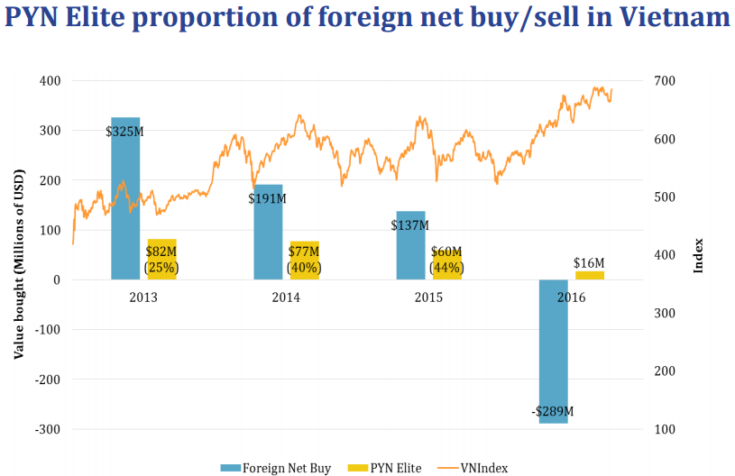 Năm 2016 vừa qua là năm thứ 4 liên tiếp Pyn Elite Fund bơm ròng vốn vào TTCK Việt Nam nhưng giá trị đã giảm đáng kể, chỉ còn 16 triệu USD. Dù vậy, trong bối cảnh nhà đầu tư nước ngoài bán ròng tổng cộng 289 triệu USD trong năm vừa qua (khoảng 6.500 tỷ đồng) thì giao dịch của Pyn Elite Fund thực sự là điểm sáng đáng chú ý.