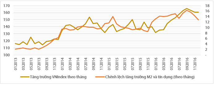 Nhìn chung, quan điểm hiện tại của RongViet Research cho rằng NHNN vẫn sẽ tiếp tục duy trì chính sách tiền tệ nới lỏng trong năm 2017. Một sự dư thừa thanh khoản trong hệ thống sẽ thúc đẩy dòng tiền len lỏi đến kênh đầu tư chứng khoán. Do đó, theo dõi chênh lệch tăng trưởng giữa cung tiền và tín dụng sẽ là chỉ báo sớm cho xu hướng giao dịch của chỉ số.