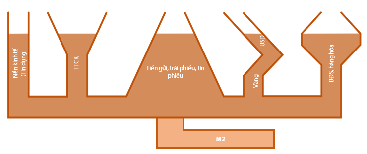 Các chuyên gia ví von, thị trường tài chính-tiền tệ có thể ví như một chiếc bình thông nhau giữa các kênh đầu tư của nền kinh tế, các loại tài sản tài chính, hàng hóa… Sự dư thừa thanh khoản trong hệ thống sẽ khiến tiền đồng chạy vào nền kinh tế qua nhiều hình thức, trong đó có kênh chứng khoán.