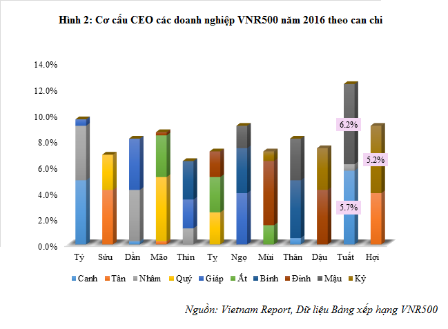 Có thể nói, năm 2016 là một năm đại thành công của doanh nhân tuổi Tuất. Xét theo can chi, tỷ lệ CEO doanh nghiệp VNR500 cao nhất là tuổi Mậu Tuất (sinh năm 1958), Canh Tuất (sinh năm 1970) và Kỷ Hợi (sinh năm 1959).