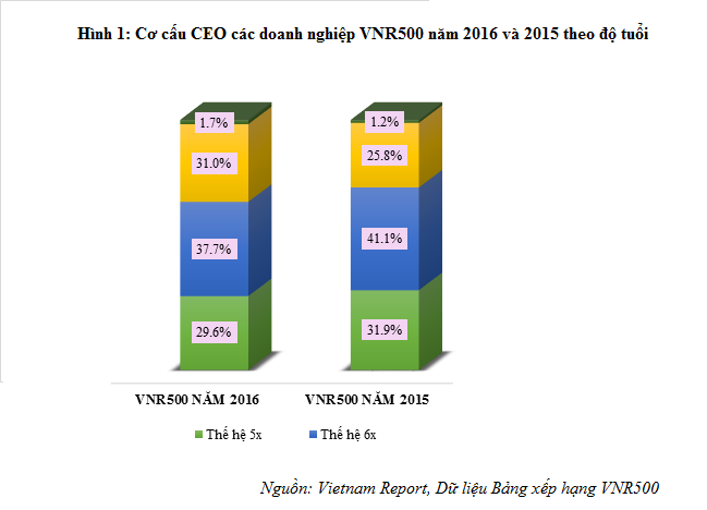 Nhìn tổng thể cơ cấu CEO của các doanh nghiệp VNR500 theo độ tuổi trong 2 năm trở lại đây có thể thấy, tỷ lệ CEO thế hệ 5x và 6x năm 2016 giảm đi đáng kể (lần lượt là 2,3% và 3,4%), thay vào đó là sự góp mặt nhiều hơn của CEO thế hệ 7x và 8x (tăng tương ứng 5,2% và 0,5%), là tín hiệu của sự trẻ hóa đội ngũ CEO các doanh nghiệp lớn Việt Nam. Đây chính là minh chứng rõ ràng nhất cho thấy các doanh nhân trẻ có đức, có tài đã sẵn sàng tiếp quản cơ nghiệp của thế hệ đi trước, tự tin điều hành doanh nghiệp cán đích thành công với thành tích không hề thua kém cả về doanh thu và lợi nhuận.