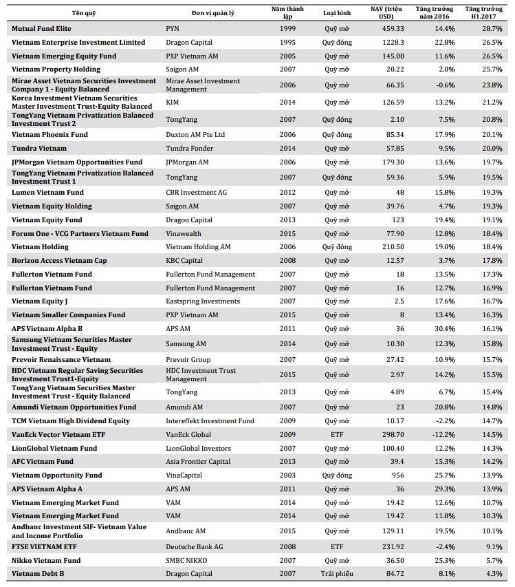 Các quỹ ngoại đạt mức tăng trưởng 19,5% trong nửa đầu 2017, cao hơn mức tăng của chỉ số VN-Index (16,8%) và tăng đáng kể so với năm 2016 (chỉ đạt 12,1% trong 6 tháng và 15,9% trong cả năm).