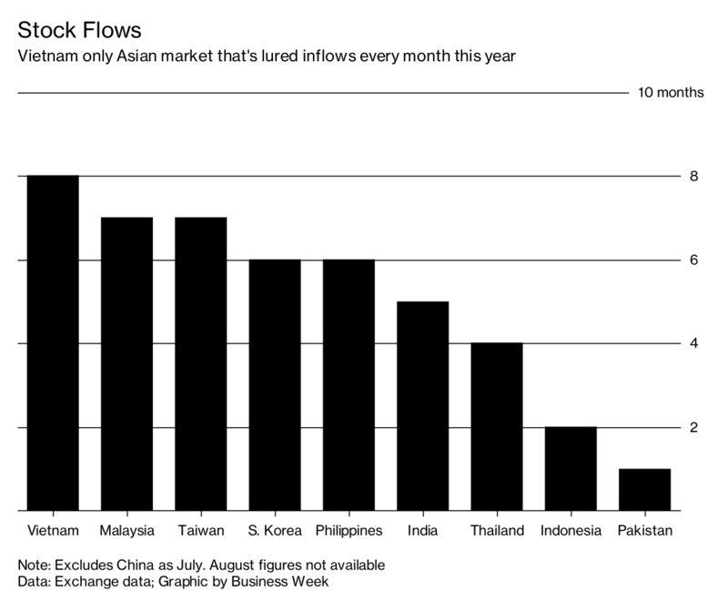 Theo số liệu của Bloomberg, dù hầu hết các thị trường chứng khoán mới nổi (emerging) và cận biên (frontier) của châu Á đều hấp dẫn trong mắt các nhà đầu tư nước ngoài và đã thu hút được một lượng vốn lớn kể từ đầu năm đến nay, Việt Nam là 1 trường hợp ngoại lệ khi luôn luôn hút ròng trong suốt 8 tháng đầu năm.