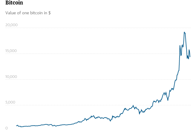 Có lẽ đây là câu chuyện tài chính gây chú ý nhất trong năm 2017. Dù có nỗi sợ rằng giá bitcoin sẽ lao dốc, nhưng 2017 sẽ được ghi nhận là năm của đồng tiền số này. Bitcoin đã liên tục tăng lên các mức kỉ lục, khi đầu năm chỉ khoảng 1.000 USD/đồng, nhưng cuối năm lại đạt gần 20.000 USD. Đã có những lúc đồng tiền này dao động dữ dội, khi mất hơn 1/4 giá trị chỉ trong một ngày, nhưng sau đó hồi phục. Các chuyên gia kinh tế cho rằng bitcoin hiện có đầy đủ những dấu hiệu của một bong bóng, khi khá tương đồng với cơn cuồng hoa tulip hồi thế kỉ 17.